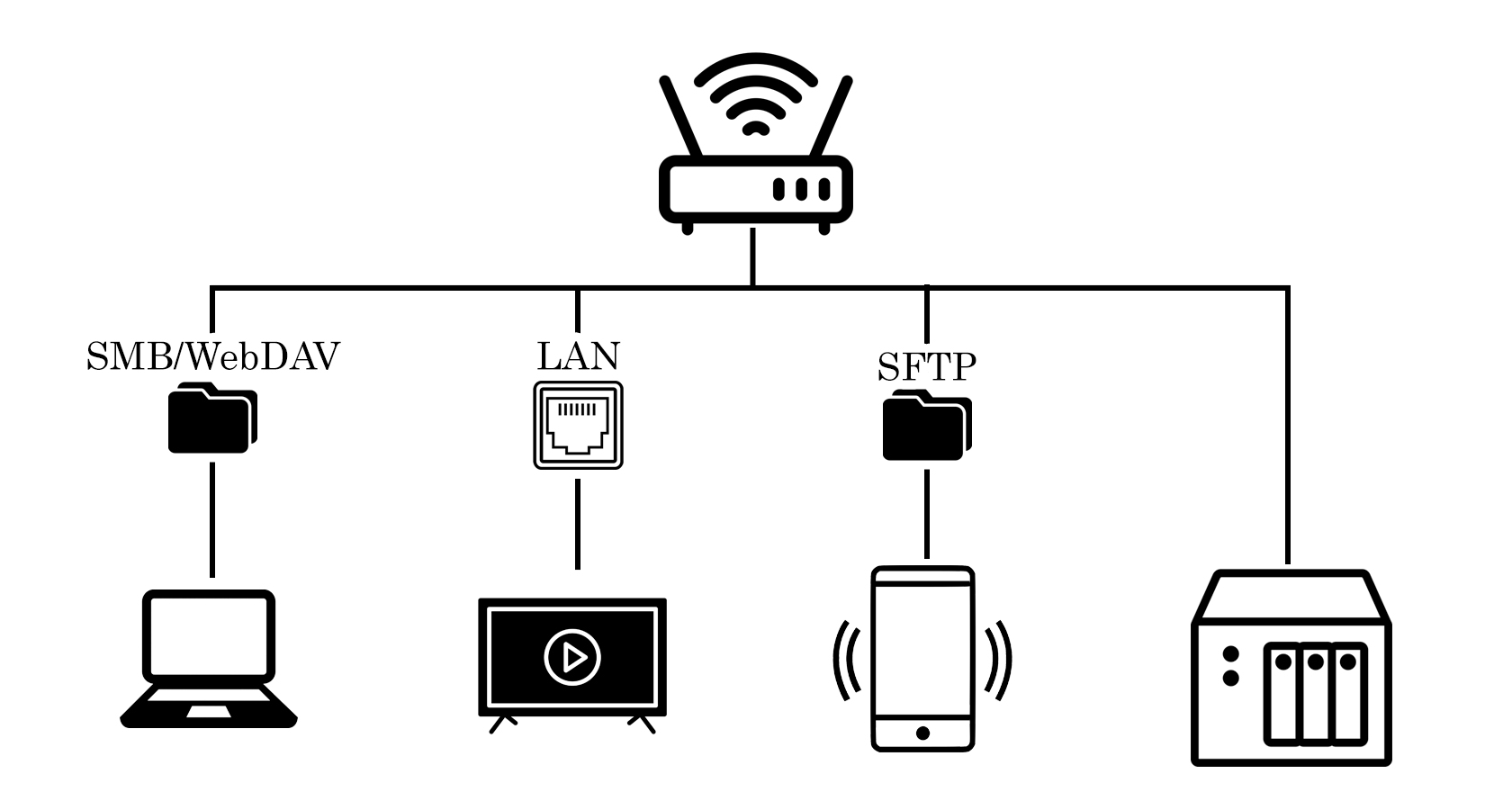 Доступ из интернетаТе же папки, но удалённо Вне дома можно подключаться к тем же папкам через интернет: безопасно по SFTP или удобно по WebDAV. Так домашнее облако остаётся вашим — доступ есть, а файлы физически лежат дома. |